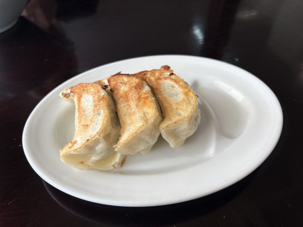 餃子は佐野系で大きい。野菜が詰まった食べごたえのある餃子で、ラーメンと餃子を交互に食べると最高の休日を感じることができる。