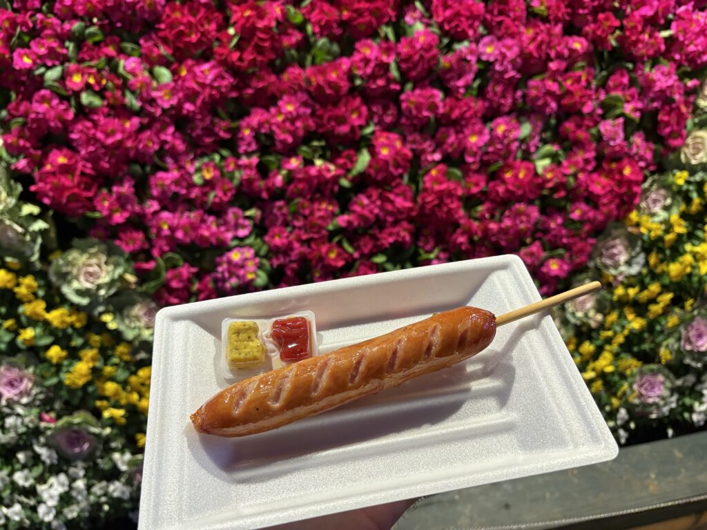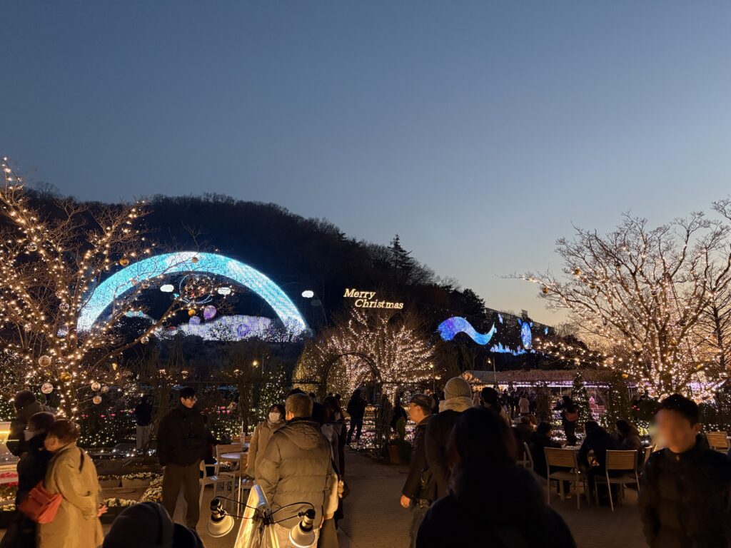 ストーブで温まる時間を稼ぐために税込350円のフランクフルトを買った。正門ゲート近くの飲食スペースに2台くらいストーブが置いてある。ストーブの向こうにイルミネーションが見える絶景。