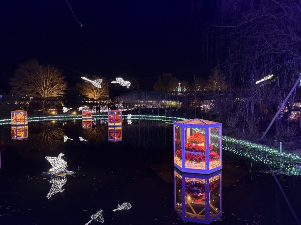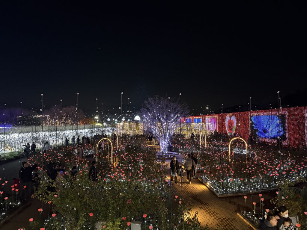 こちらは両毛線線路側の「光のバラ園」というエリアだ。光が付いたり消えたりするので写真を撮るタイミングが難しい。