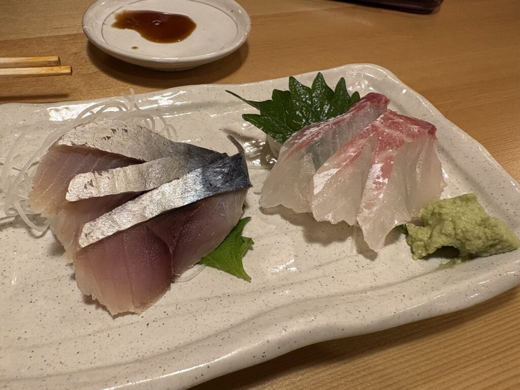 〆さば刺(税込494円)と真鯛刺(494円)も食べた。揚げ物と刺し身をバランス良く食べると具合が悪くならずに済む。そして、普段の食事より健康的ではないだろうか。