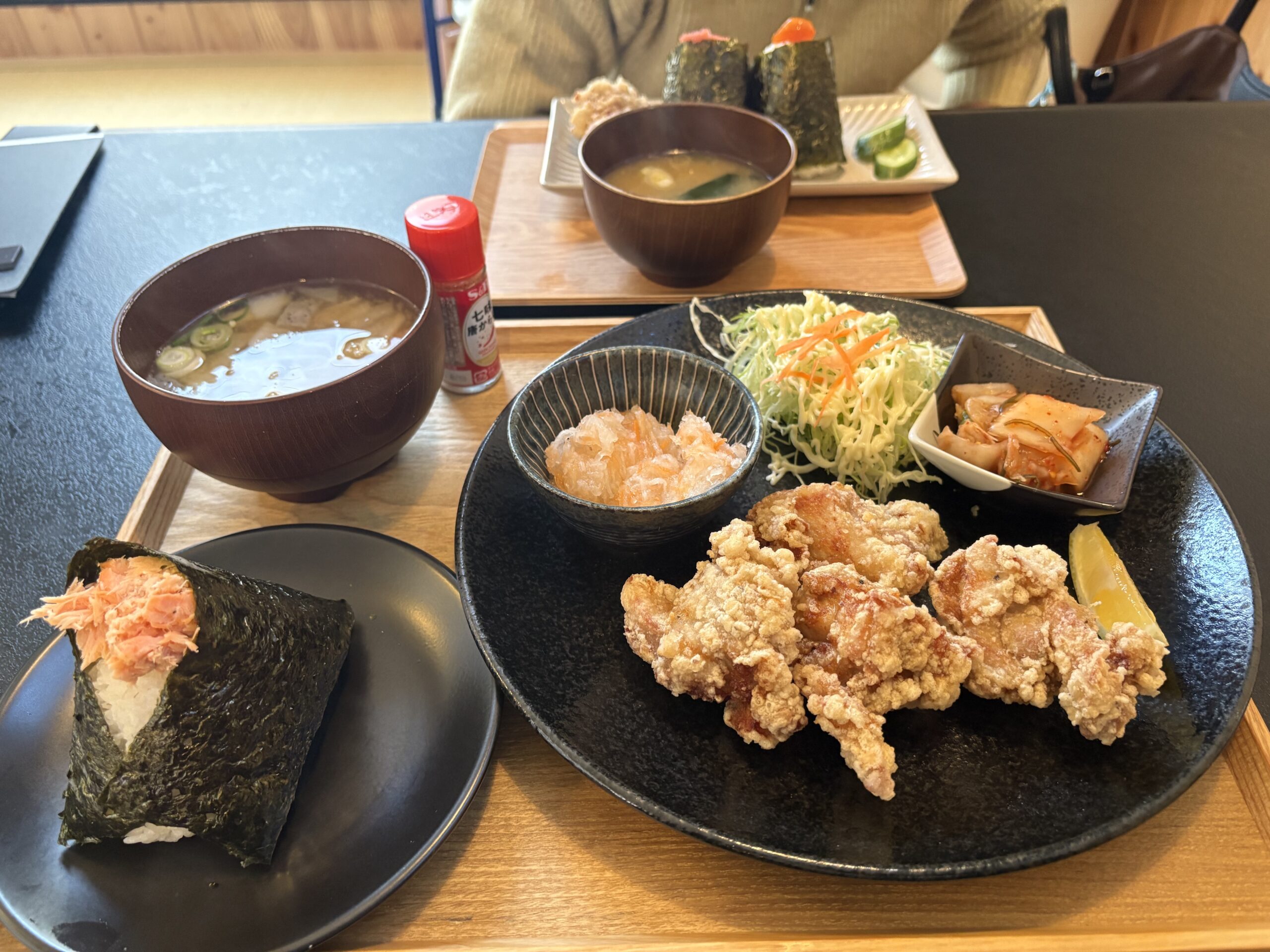唐揚げランチは唐揚げが4個と大きなおにぎり、サラダ、キムチ、大根の酢の物、そして豚汁と普段の食事とは次元の違う充実具合だ。今回は豚汁にしたが、普通のみそ汁も非常においしい。